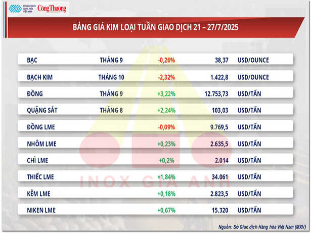 Thị trường kim loại khép lại tuần giao dịch vừa qua với những biến động trái chiều, trong đó nổi bật là diễn biến tích cực của giá quặng sắt. Kết thúc phiên ngày 25/7, hợp đồng quặng sắt kỳ hạn tháng 8 tăng 2,24% trong tuần, lên mức 103,03 USD/tấn, ghi dấu tuần tăng thứ năm liên tiếp.
